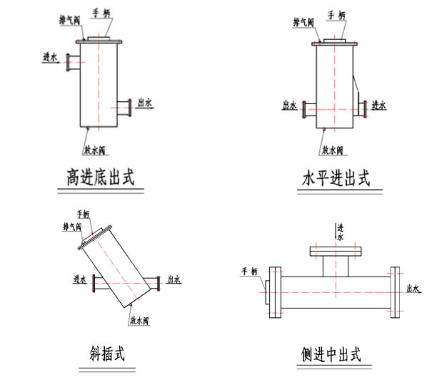 我們將根據客戶的現場尺寸及運行工況,在滿足通流比的情況下,為客戶量身定做不同形式的濾水器,如水平進出式、斜插式、高進低出式、側進中出式等。